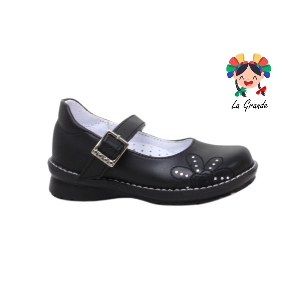 Este zapato escolar para niña, modelo 593 DOMINIQ Negro, tiene un ajuste de hebilla para mayor seguridad y comodidad. Además, su diseño de flor le da un toque elegante y moderno. Perfecto para cualquier ocasión y para mantener a tu hija siempre a la moda. ¡No te lo pierdas!